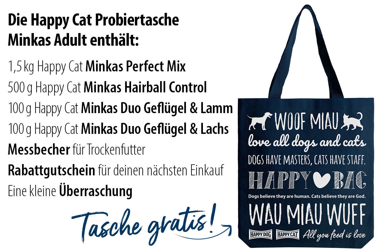 Möchte deine Samtpfote unser Happy Cat Minkas Futter testen? In der Happy Cat Minkas Adult Probiertasche steckt eine leckere Vielfalt der Happy Cat Minkas Produkte zum kleinen Preis.